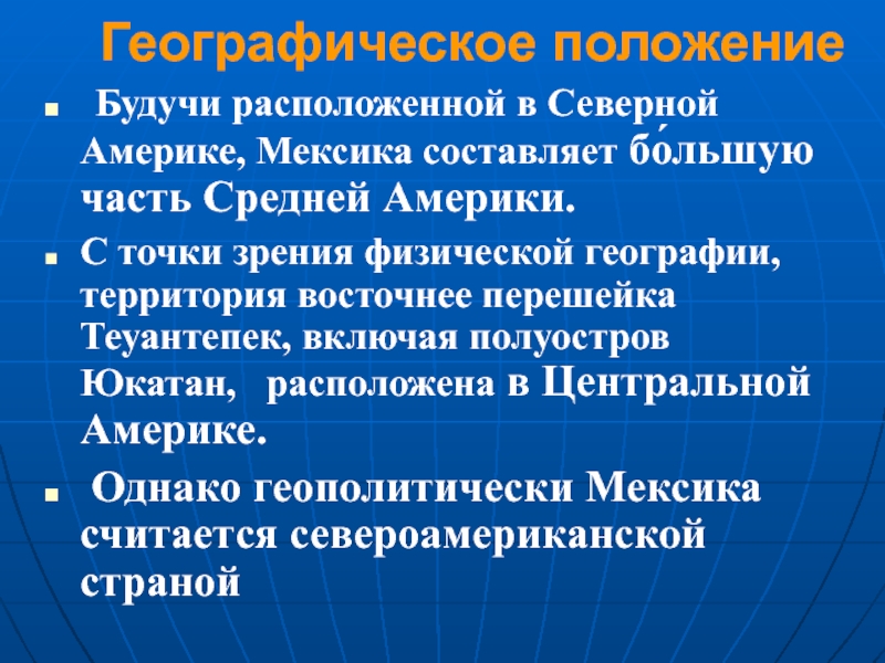 С точки зрения физической географии, территория восточнее перешейка Теуантепек, включая полуостров Юкатан, расположена в Центральной Америке.