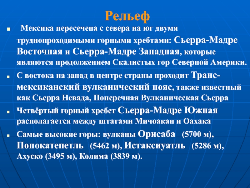 Мексика пересечена с севера на юг двумя труднопроходимыми горными хребтами:
