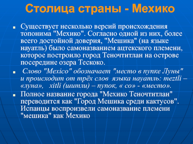 Существует несколько версий происхождения топонима "Мехико". Согласно одной