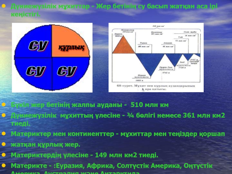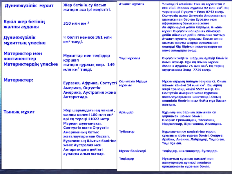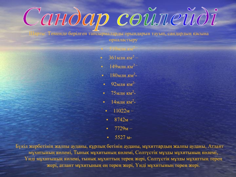 Бүкіл Жер бетінің жалпы ауданы, құрлық бетінің ауданы, мұхиттардың жалпы ауданы, Атлант мұхитының көлемі, Тынық мұхитының көлемі, Солтүстік Мұзды мұхитының көлемі, Үнді мұхитының көлемі, Тынық мұхиттың ең терең жері, Солтүстік мұзды мұхиттың ең терең жері, Атлант мұхитының ең терең жері, Үнді мұхитының ең терең жері.