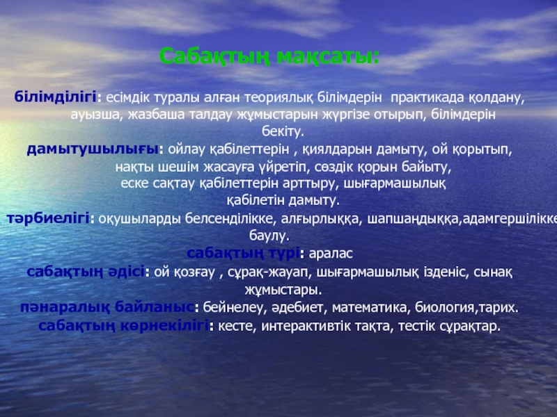 қызығушылығын арттыру, жан-жақты ойларын дамыту, өз бетінше ізденулеріне бағыт беру және іскерлігімен танымдық белсенділігін арттыру.