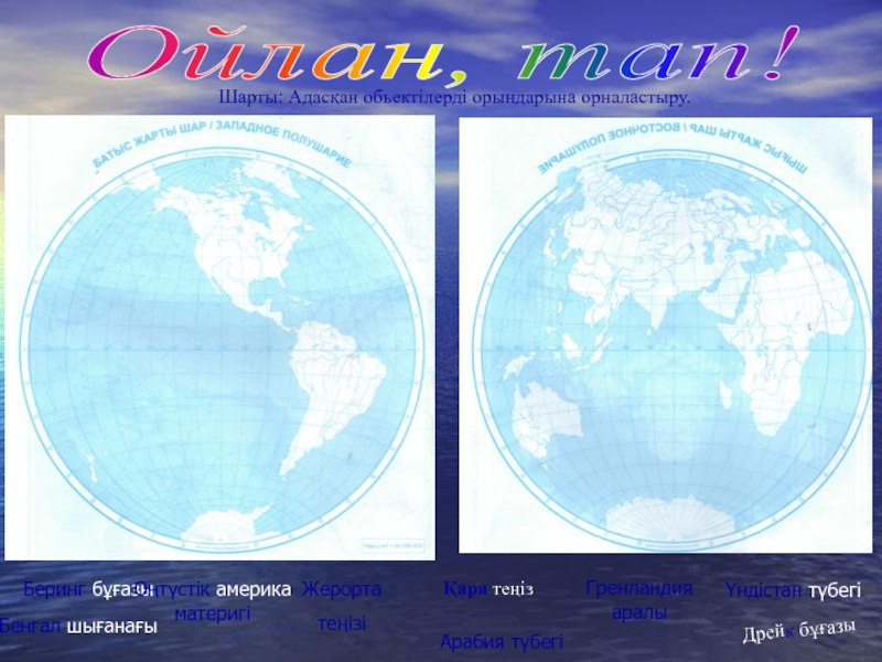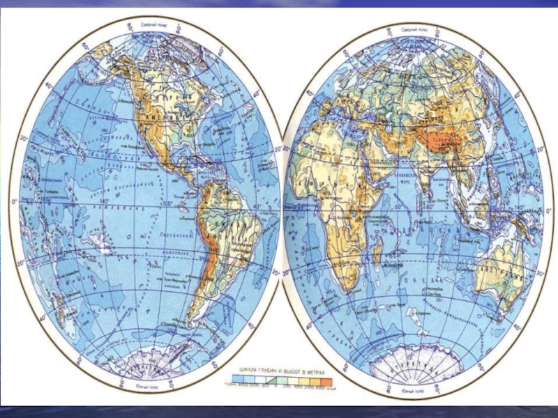 Кескін картаға мұхиттар, материктер, теңіздер, аралдар, шығанақтар, түбектер, бұғаздарды түсіріп келу.