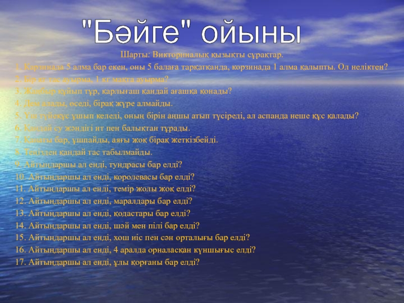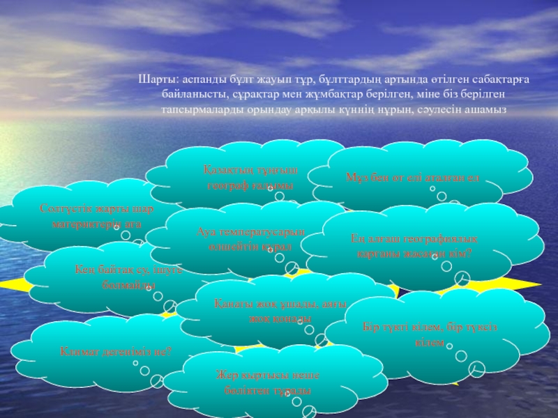 Шарты: аспанды бұлт жауып тұр, бұлттардың артында өтілген сабақтарға байланысты, сұрақтар мен жұмбақтар берілген, міне біз берілген тапсырмаларды орындау арқылы күннің нұрын, сәулесін ашамыз