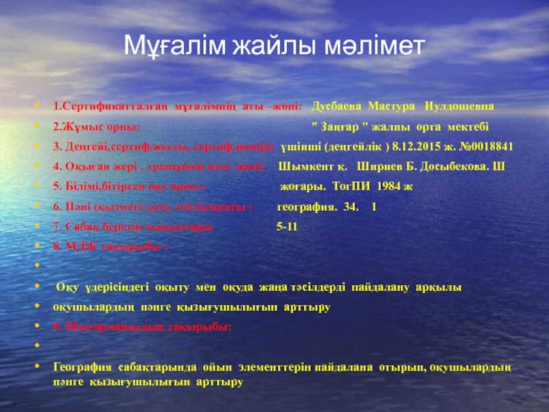 1.Cертификатталған мұғалімнің аты –жөні: Дусбаева Мастура