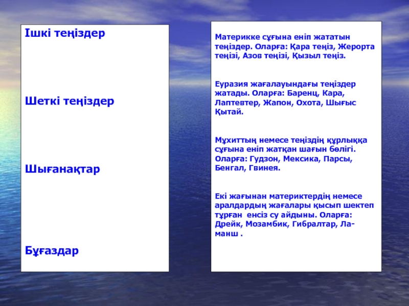 Ішкі теңіздер - Материкке сұғына еніп жататын теңіздер. Оларға: Қара теңіз, Жерорта теңізі, Азов теңізі, Қызыл теңіз.