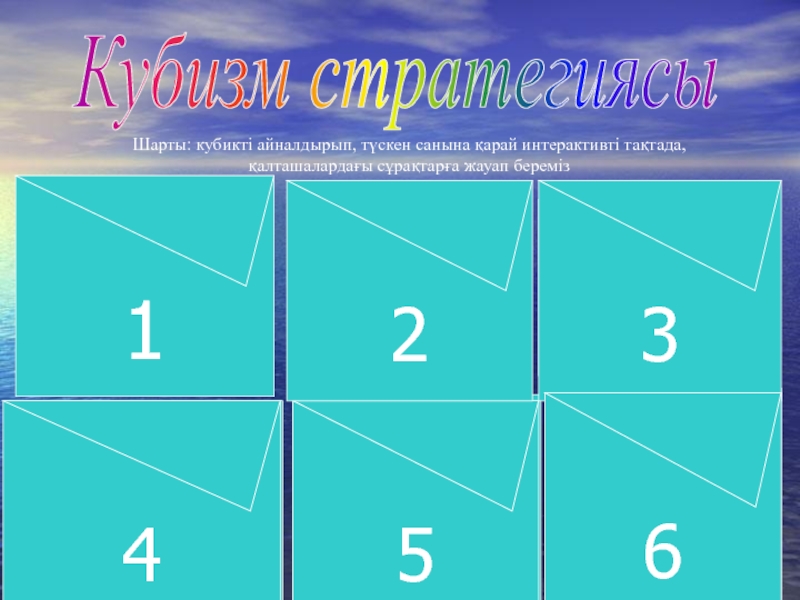 Шарты: кубикті айналдырып, түскен санына қарай интерактивті тақтада, қалташалардағы сұрақтарға жауап береміз