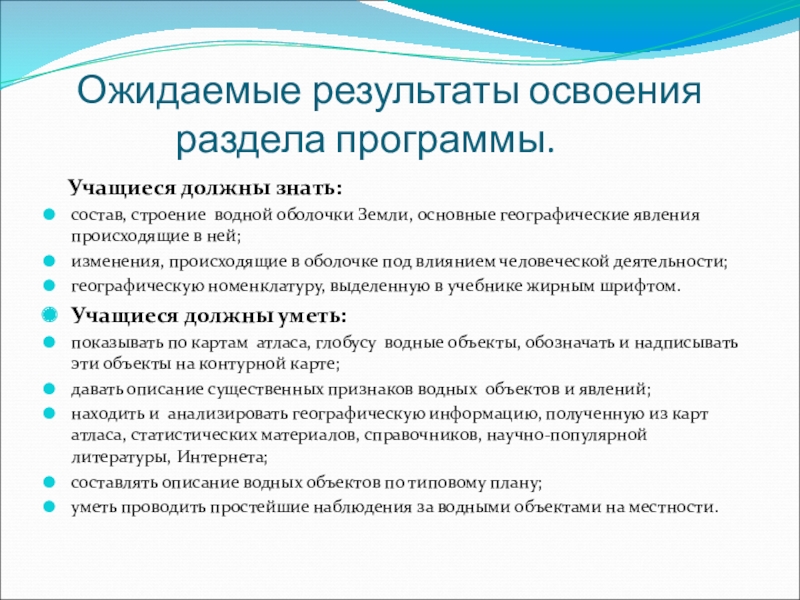 Сформировать представления о частях гидросферы и их особенностях, о свойствах воды как жидкости, ее агрегатных состояниях и связи оболочки с другими оболочками Земли.