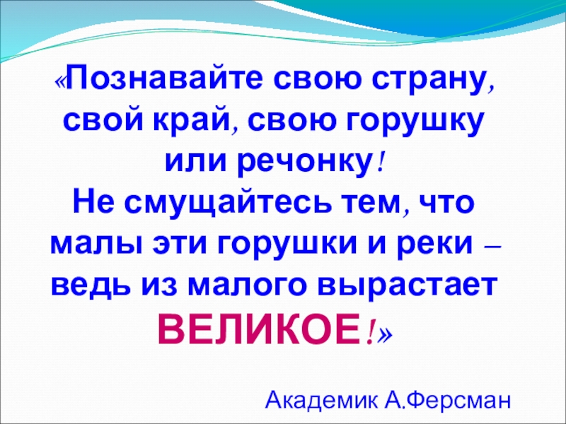 Слайд 13«Познавайте свою страну, свой край, свою горушку или речонку!