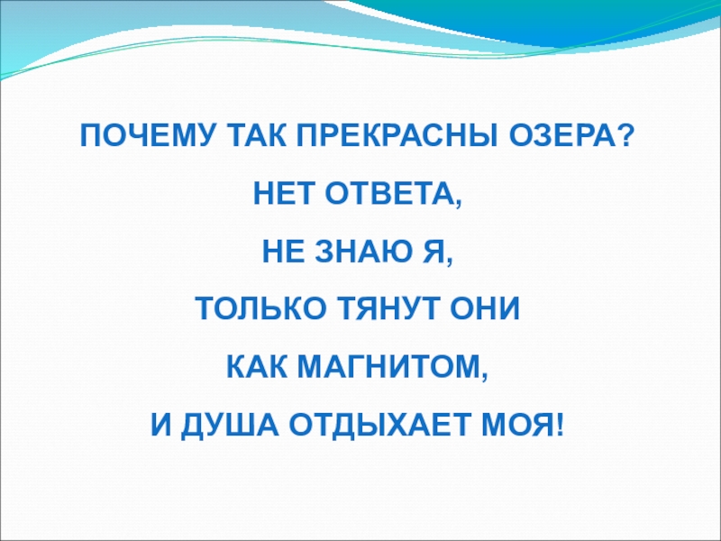 Слайд 12ПОЧЕМУ ТАК ПРЕКРАСНЫ ОЗЕРА? НЕТ ОТВЕТА,
