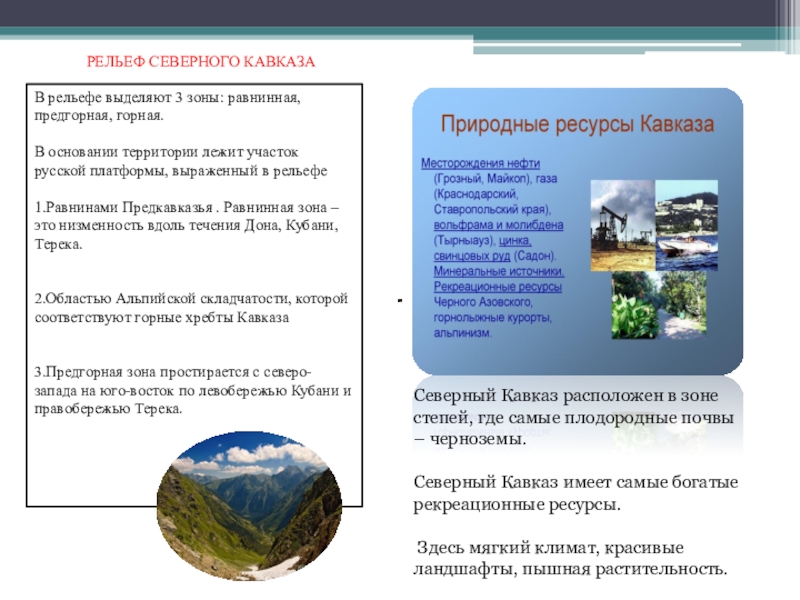 Рельеф: на севере равнинный, на юге горный. Кавказ молодые, складчатые, высокие горы. Эльбрус 5642м, Казбек 5033м. Горообразование продолжается. Три части -Скалистый, Боковой, Главный хребет.