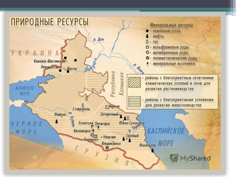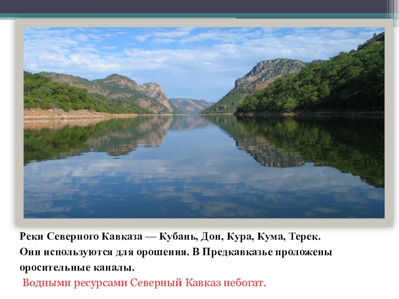 Реки: Северокавказские реки Дон, Кубань, Терек, используются для орошения и водных ресурсов не хватает.