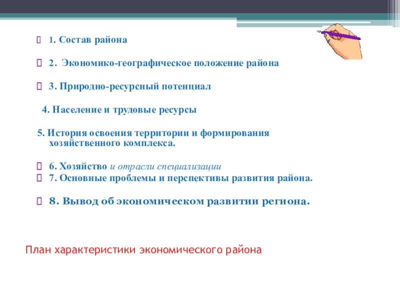 Вывод: имеет значительные Рекреационные, Агроклиматические, земельные, топливные ресурсы. Это условия для развития в районе: