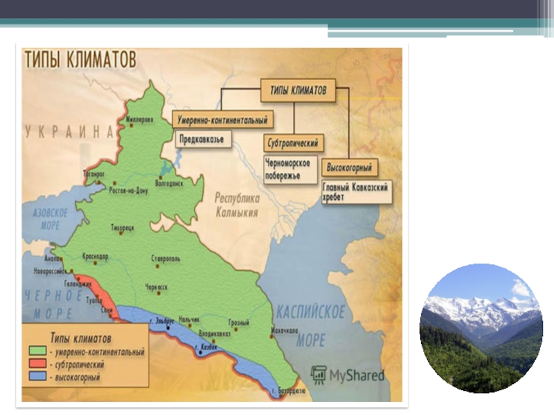 Климат: умеренный климат, длинное и очень теплое лето. Осадков выпадает больше на западе . На Черноморском побережье климат субтропический самая теплая зима. В горах температура воздуха понижается. В горах образуются местные ветры – фен и бора.