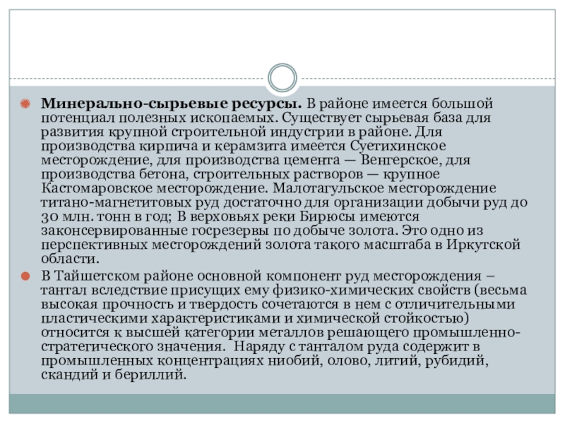 Слайд 17Минерально-сырьевые ресурсы. В районе имеется большой потенциал полезных ископаемых. Существует сырьевая база