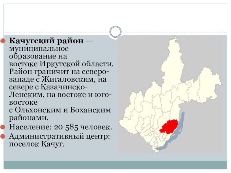 Слайд 20Качугский район — муниципальное образование на востоке Иркутской области. Район граничит на северо-западе