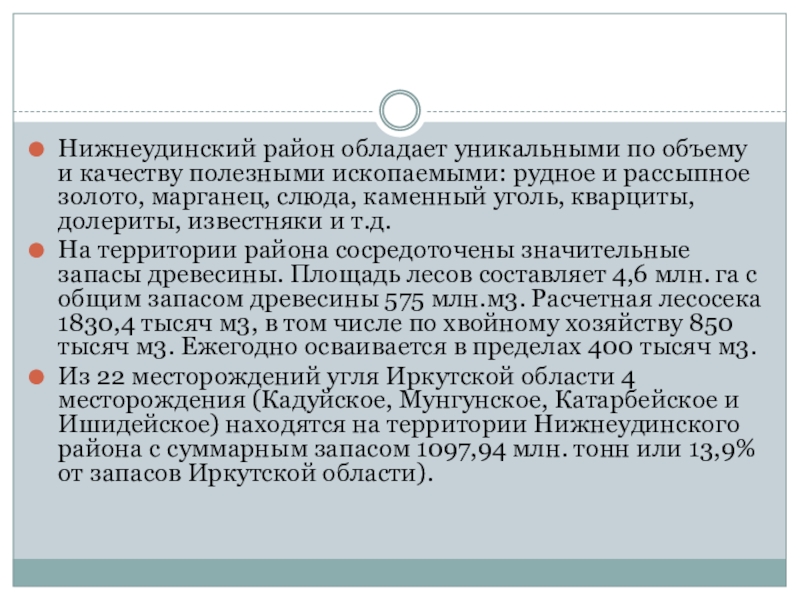 Слайд 28Нижнеудинский район обладает уникальными по объему и качеству полезными ископаемыми: рудное