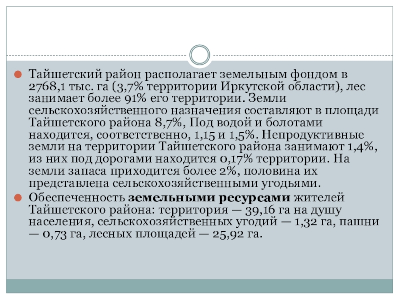 Слайд 16Тайшетский район располагает земельным фондом в 2768,1 тыс. га (3,7% территории Иркутской