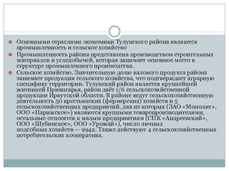 Слайд 13Основными отраслями экономики Тулунского района являются промышленность и сельское хозяйство