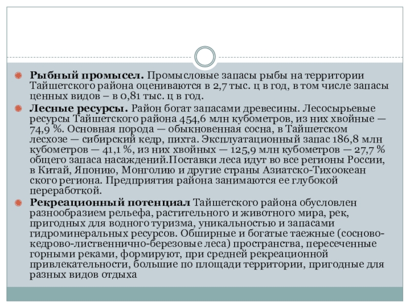 Слайд 19Рыбный промысел. Промысловые запасы рыбы на территории Тайшетского района оцениваются в 2,7