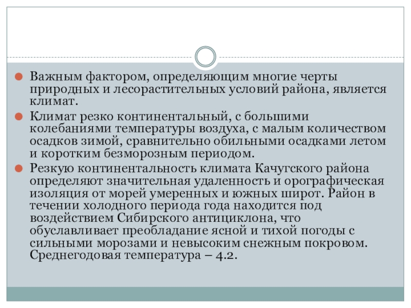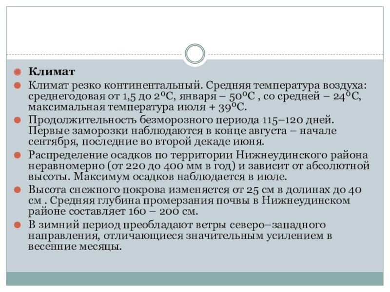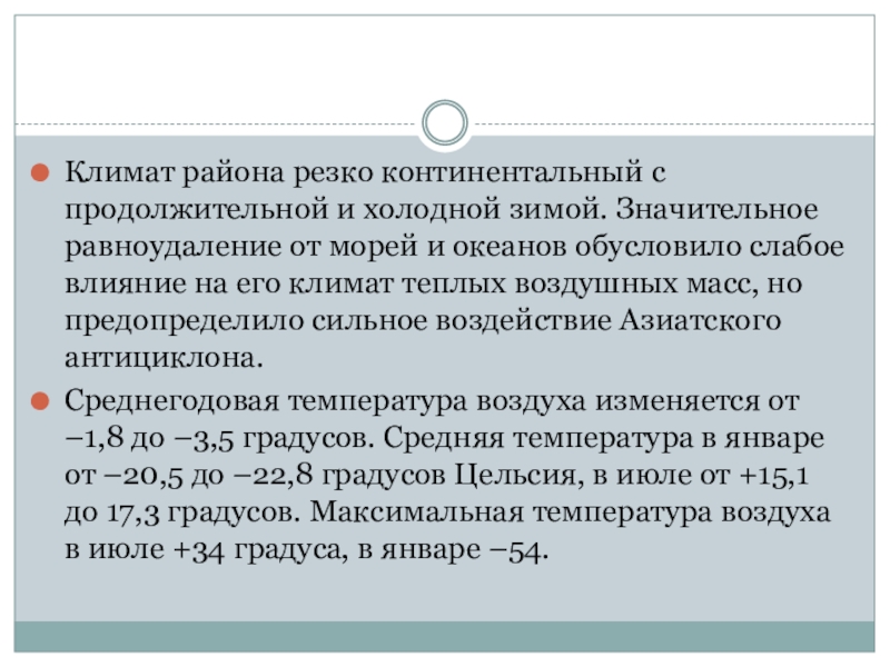 Слайд 10Климат района резко континентальный с продолжительной и холодной зимой. Значительное равноудаление