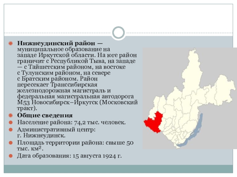 Слайд 26Нижнеудинский район — муниципальное образование на западе Иркутской области. На юге район граничит