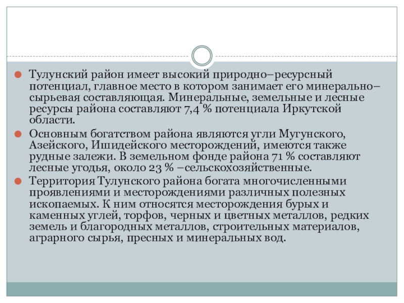 Слайд 12Тулунский район имеет высокий природно–ресурсный потенциал, главное место в котором занимает
