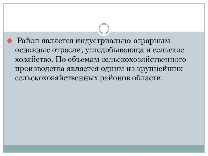 Слайд 11 Район является индустриально-аграрным – основные отрасли, угледобывающа и сельское хозяйство. По