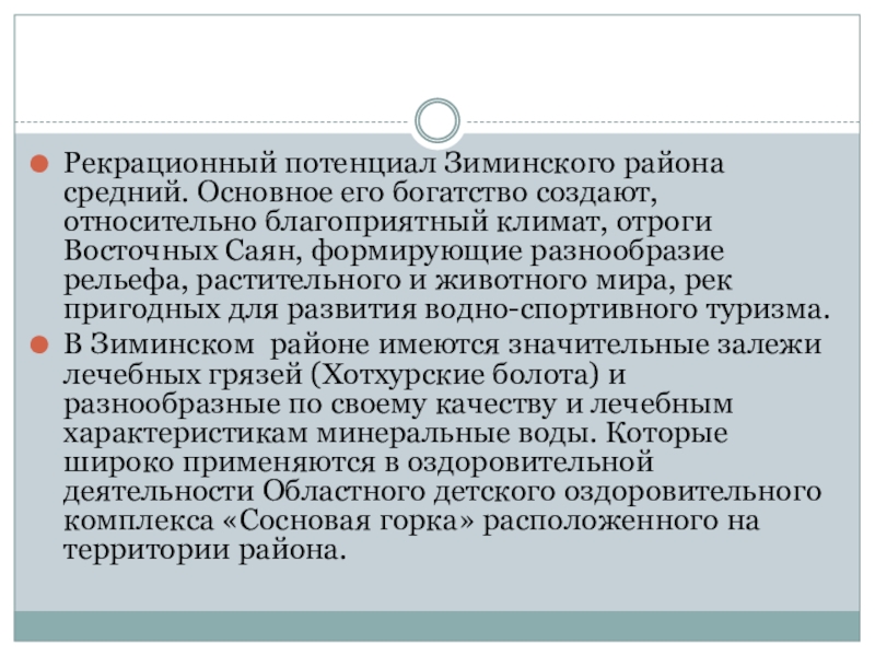 Слайд 5Рекрационный потенциал Зиминского района средний. Основное его богатство создают, относительно благоприятный