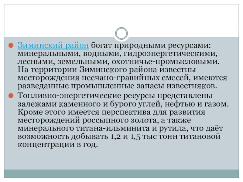 Слайд 4Зиминский район богат природными ресурсами: минеральными, водными, гидроэнергетическими, лесными, земельными, охотничье-промысловыми. На
