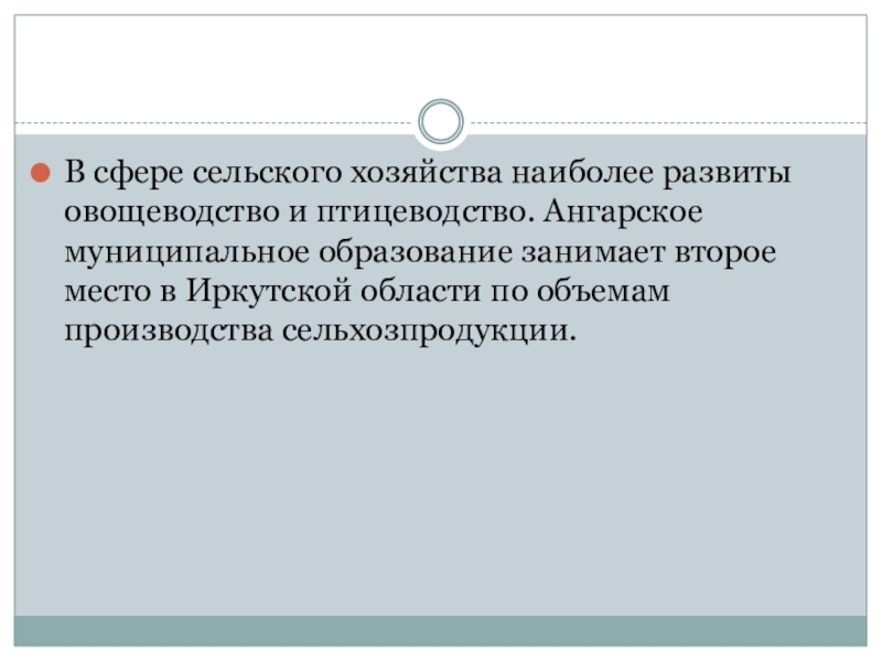 Слайд 34В сфере сельского хозяйства наиболее развиты овощеводство и птицеводство. Ангарское муниципальное