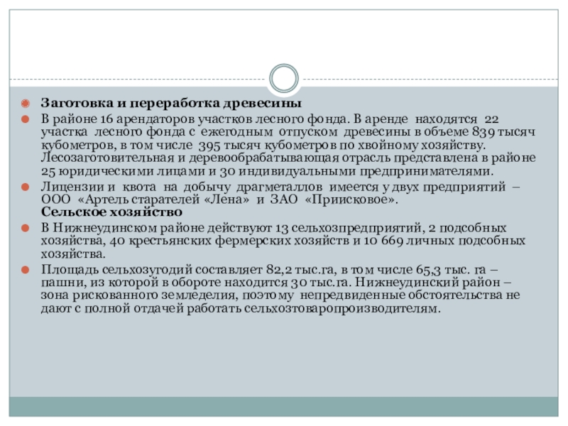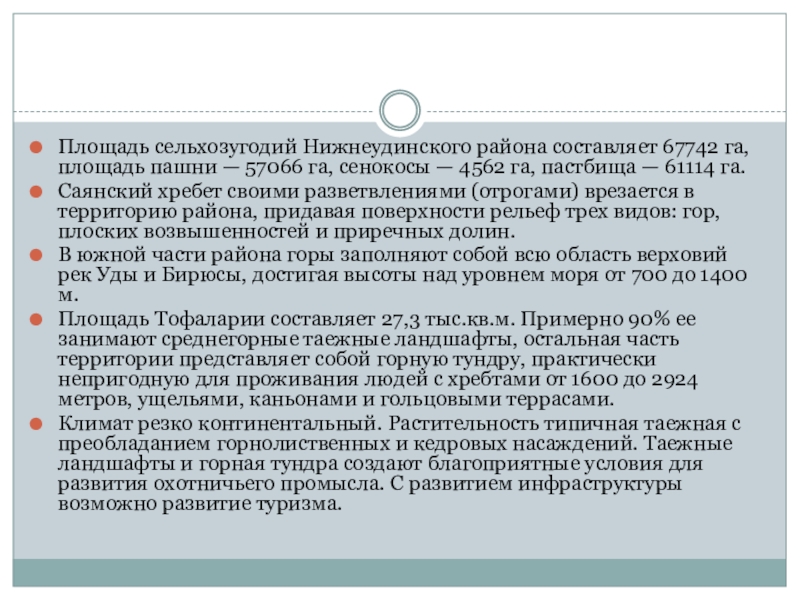 Слайд 29Площадь сельхозугодий Нижнеудинского района составляет 67742 га, площадь пашни — 57066 га,