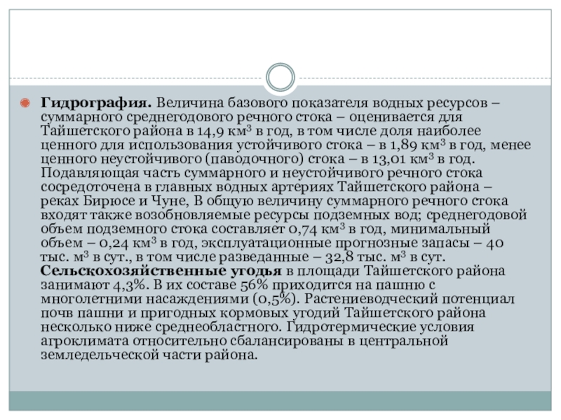 оценивается для Тайшетского района в 14,9 км3 в год, в том числе доля наиболее ценного для использования устойчивого стока – в 1,89 км3 в год, менее ценного неустойчивого (паводочного) стока – в 13,01 км3 в год. Подавляющая часть суммарного и неустойчивого речного стока сосредоточена в главных водных артериях Тайшетского района – реках Бирюсе и Чуне, В общую величину суммарного речного стока входят также возобновляемые ресурсы подземных вод; среднегодовой объем подземного стока составляет 0,74 км3 в год, минимальный объем – 0,24 км3 в год, эксплуатационные прогнозные запасы – 40 тыс. м3 в сут., в том числе разведанные – 32,8 тыс. м3 в сут. Сельскохозяйственные угодья в площади Тайшетского района занимают 4,3%. В их составе 56% приходится на пашню с многолетними насаждениями (0,5%). Растениеводческий потенциал почв пашни и пригодных кормовых угодий Тайшетского района несколько ниже среднеобластного. Гидротермические условия агроклимата относительно сбалансированы в центральной земледельческой части района.