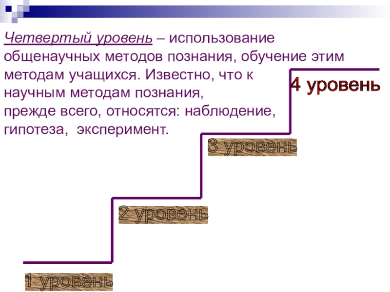 Слайд 27Четвертый уровень – использование общенаучных методов познания, обучение этим методам учащихся.