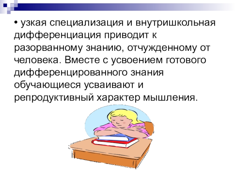 Слайд 15• узкая специализация и внутришкольная дифференциация приводит к разорванному знанию, отчужденному