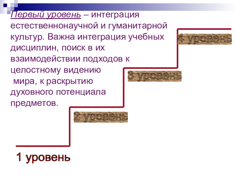 Слайд 24Первый уровень – интеграция естественнонаучной и гуманитарной культур. Важна интеграция учебных
