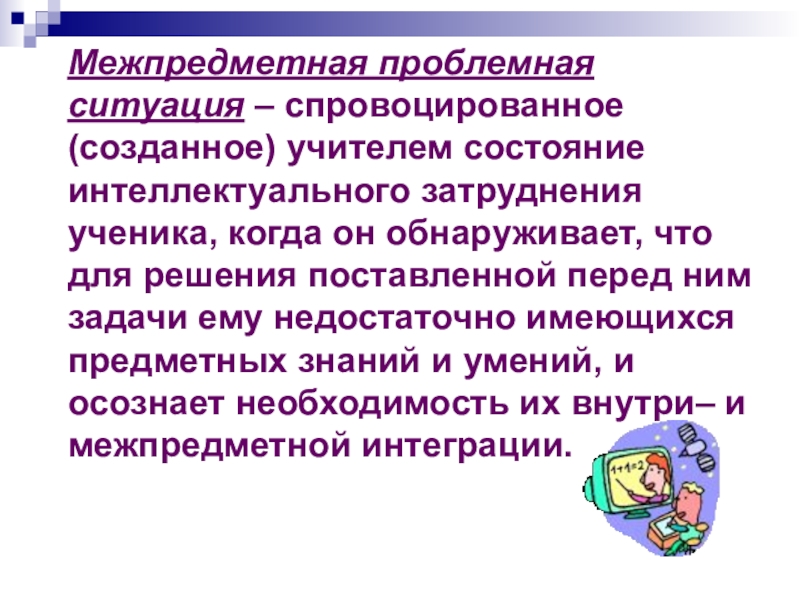Слайд 35Межпредметная проблемная ситуация – спровоцированное (созданное) учителем состояние интеллектуального затруднения ученика,