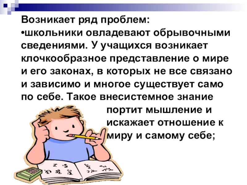 •школьники овладевают обрывочными сведениями. У учащихся возникает клочкообразное представление