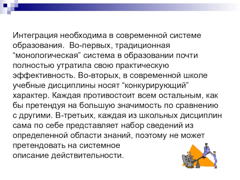 Слайд 12Интеграция необходима в современной системе образования. Во-первых, традиционная “монологическая” система в