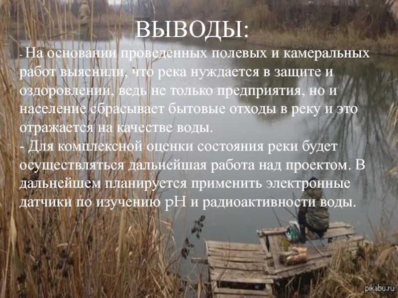 - Для комплексной оценки состояния реки будет осуществляться дальнейшая работа над проектом. В дальнейшем планируется применить электронные датчики по изучению pH и радиоактивности воды.