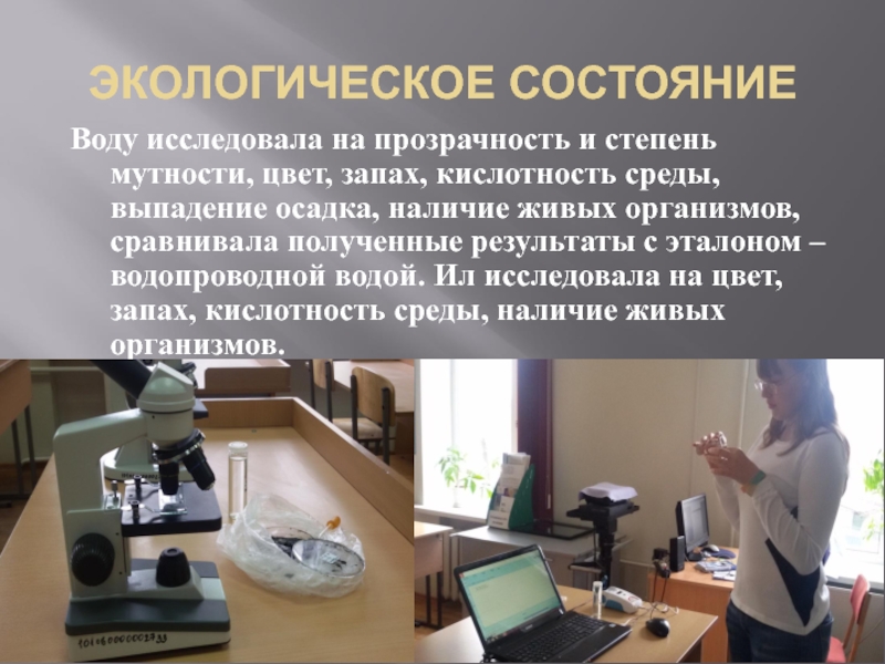 среды, выпадение осадка, наличие живых организмов, сравнивала полученные результаты с эталоном – водопроводной водой. Ил исследовала на цвет, запах, кислотность среды, наличие живых организмов.