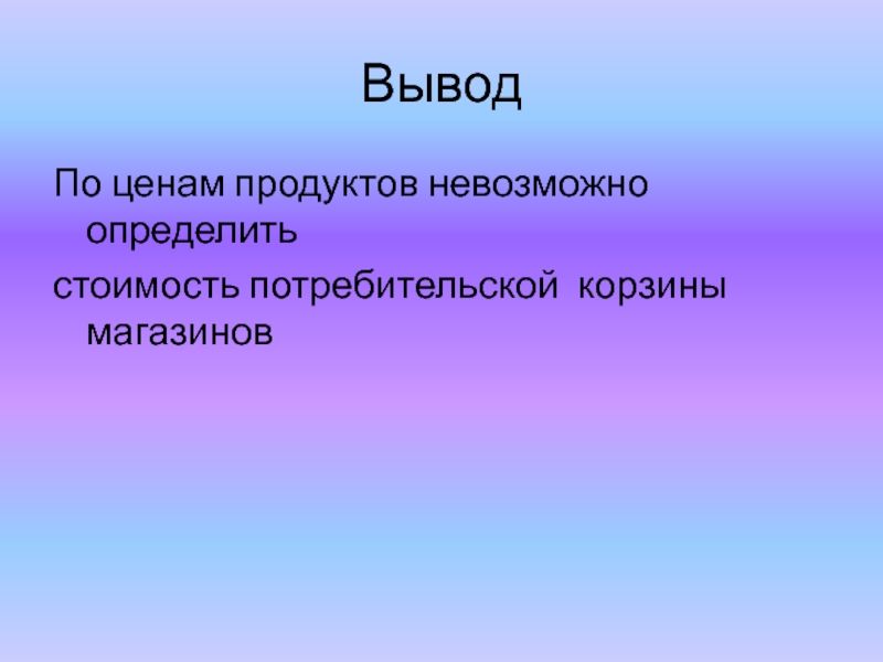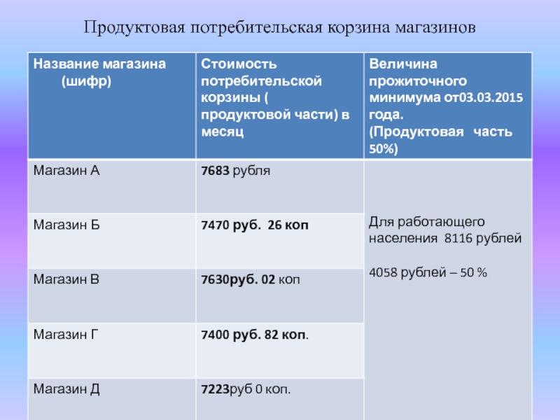Слайд 24Продуктовая потребительская корзина магазинов