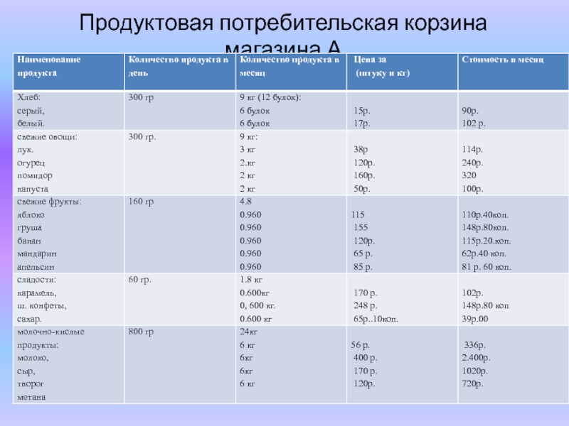 Слайд 23Продуктовая потребительская корзина магазина А