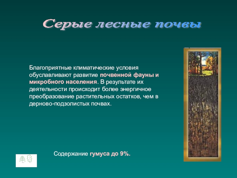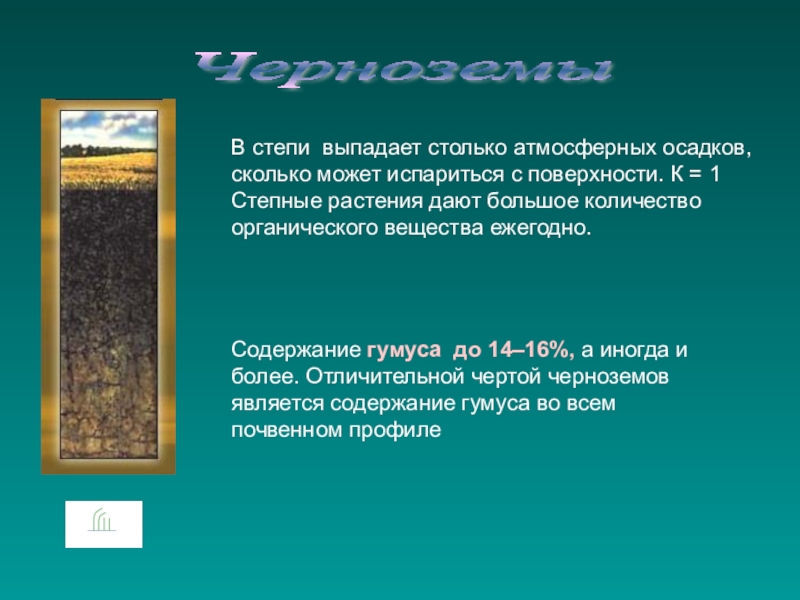 Содержание гумуса до 14–16%, а иногда и более. Отличительной чертой черноземов является содержание гумуса во всем почвенном профиле