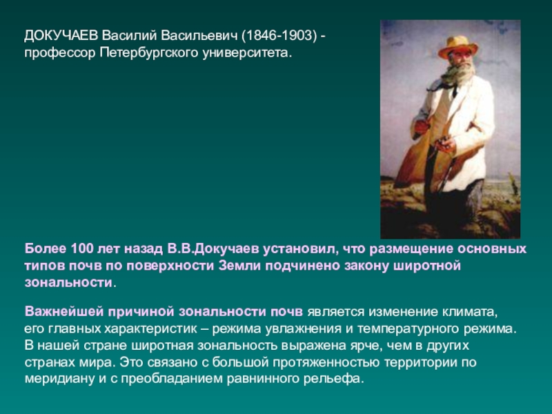 Важнейшей причиной зональности почв является изменение климата, его главных характеристик – режима увлажнения и температурного режима. В нашей стране широтная зональность выражена ярче, чем в других странах мира. Это связано с большой протяженностью территории по меридиану и с преобладанием равнинного рельефа.