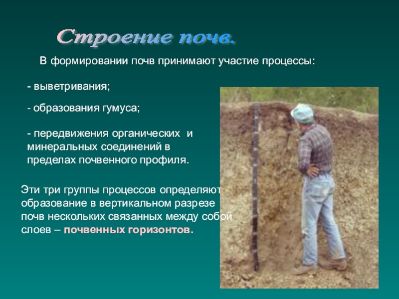 Эти три группы процессов определяют образование в вертикальном разрезе почв нескольких связанных между собой слоев – почвенных горизонтов.