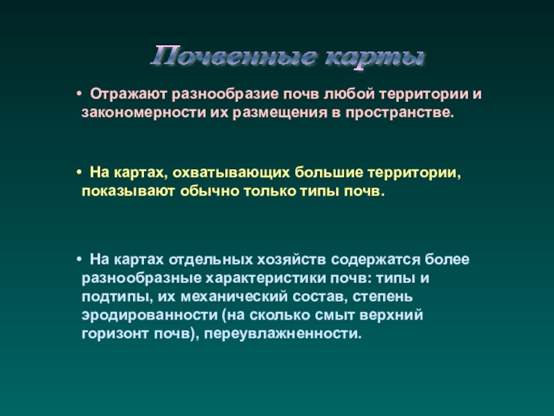 На картах, охватывающих большие территории, показывают обычно только типы почв.