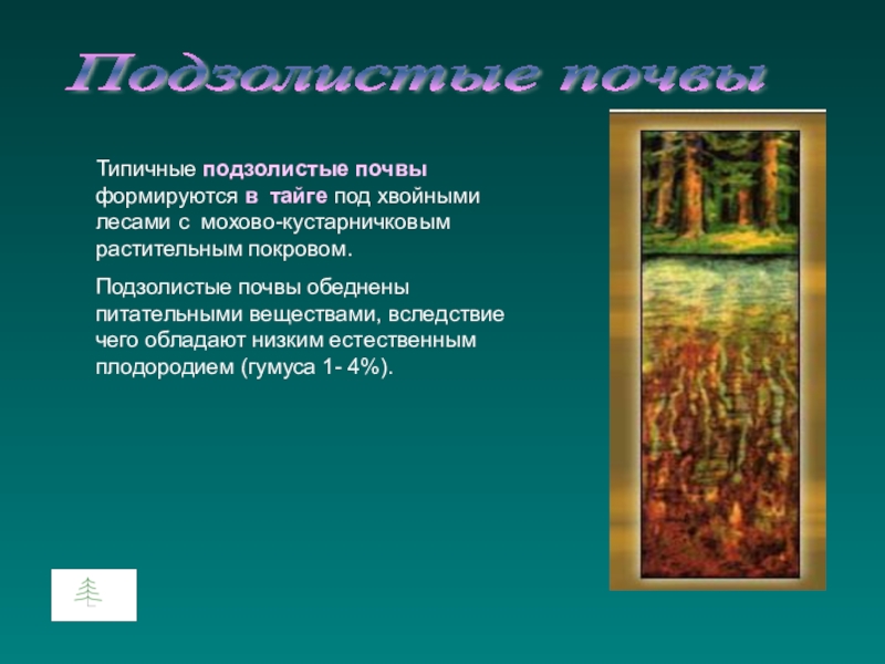 В теплый сезон оттаивает небольшой верхний слой. Из-за переувлажнения почвы и недос-татка кислорода мало растений, а значит мало перегноя.