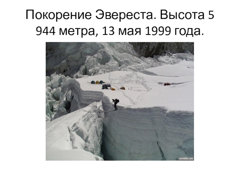 Слайд 8Покорение Эвереста. Высота 5 944 метра, 13 мая 1999 года.