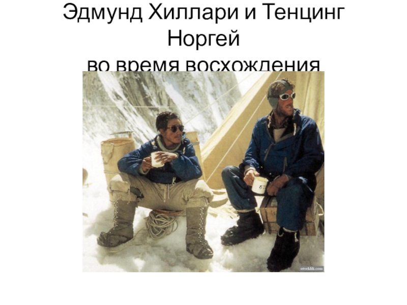 Слайд 5Эдмунд Хиллари и Тенцинг Норгей во время восхождения