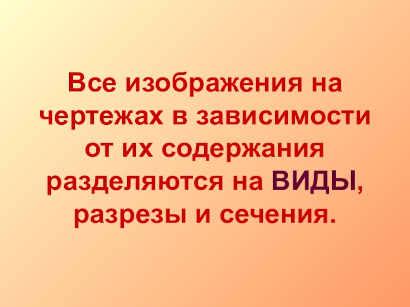 Все изображения на чертежах в зависимости от их содержания разделяются на ВИДЫ, разрезы и сечения.